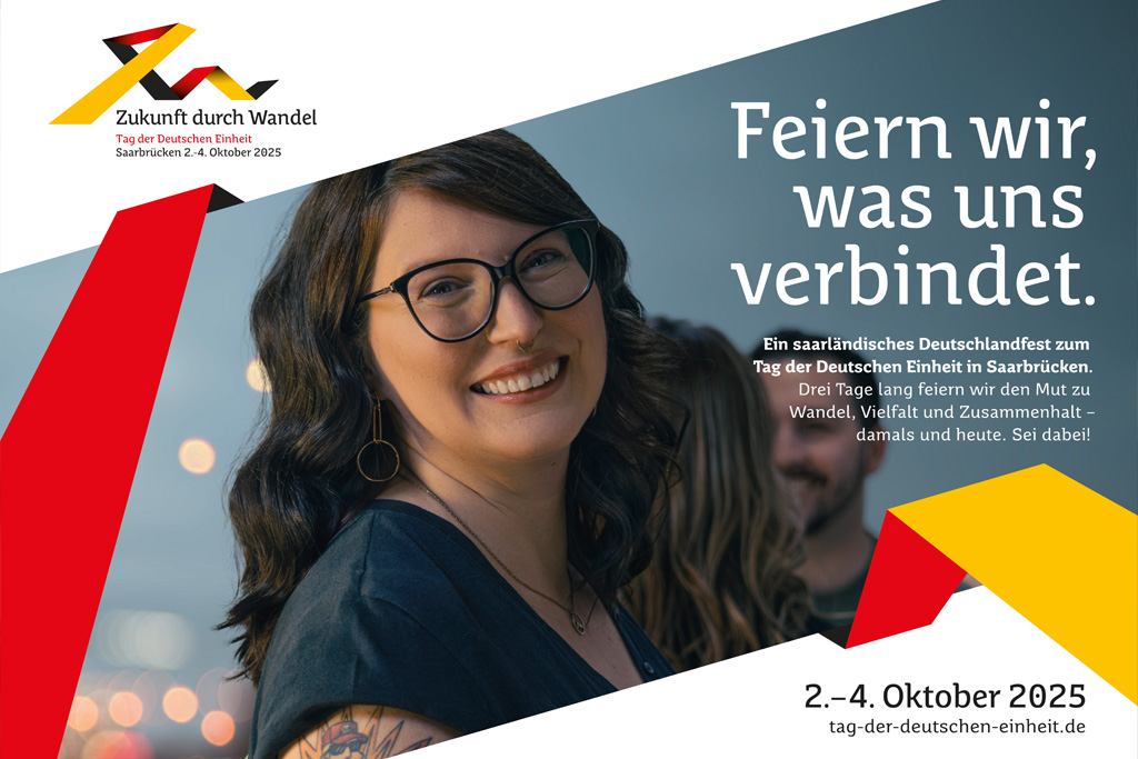 Vom 2. bis 4. Oktober entsteht in der Saarbrücker Innenstadt ein lebendiger Festbereich zum Tag der Deutschen Einheit. Hier präsentiert sich das Saarland mit einem abwechslungsreichen Unterhaltungsprogramm, mit Kunst und Kultur, Kulinarik und Kommunikation. Aber auch mit seinen touristischen Highlights. Neben den Verfassungsorganen präsentieren sich alle Bundesländer, viele Institutionen und saarländische Unternehmen, um gemeinsam die Wiedervereinigung zu feiern und Austausch und Zusammenhalt zu fördern.